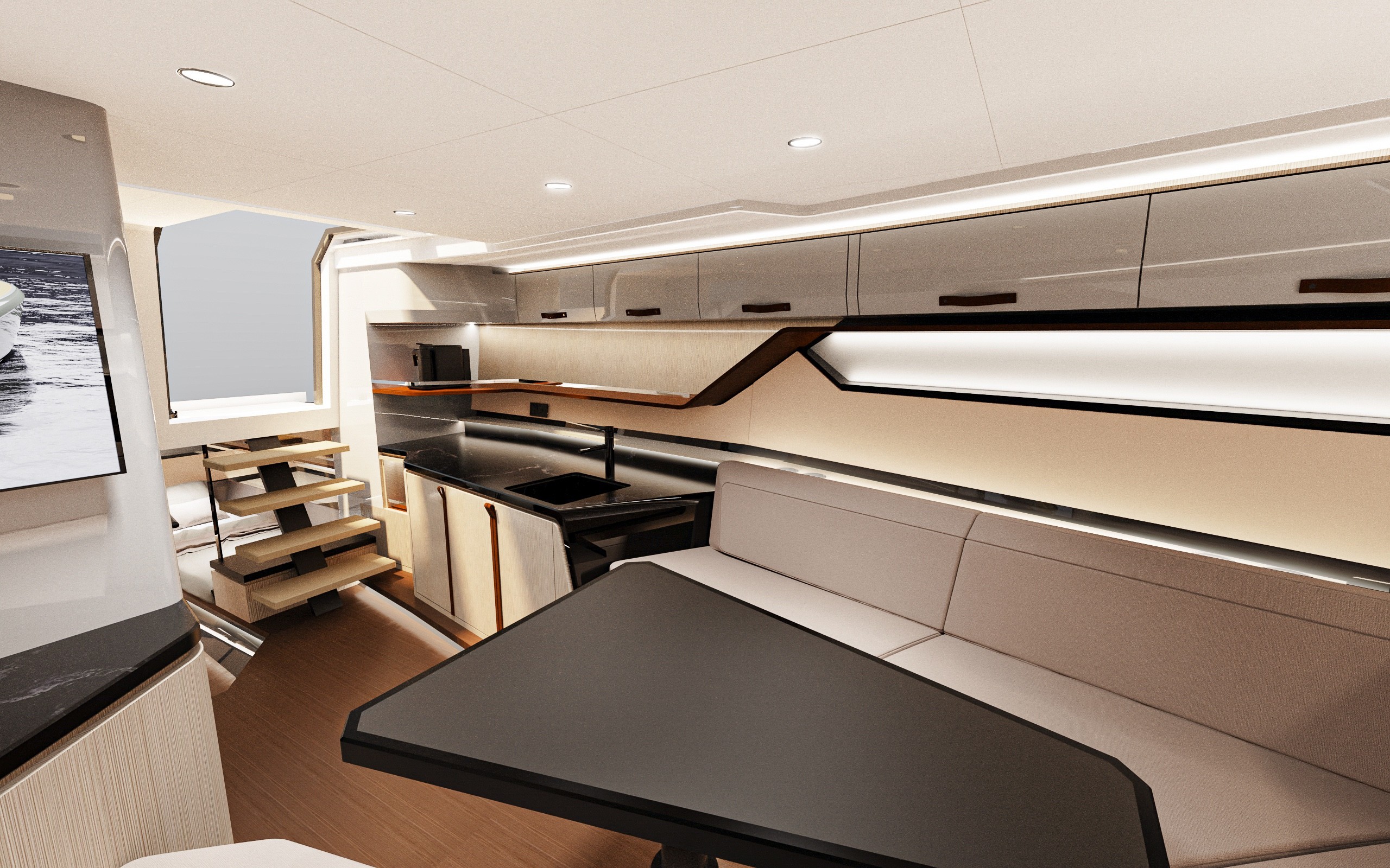 Step inside the Flynt 48 Revolante and you enter an atmosphere of quiet refinement. The interior is shaped with the same sculptural precision as the exterior: clean lines, warm materials and seamless transitions creating a space that feels both modern and timeless.